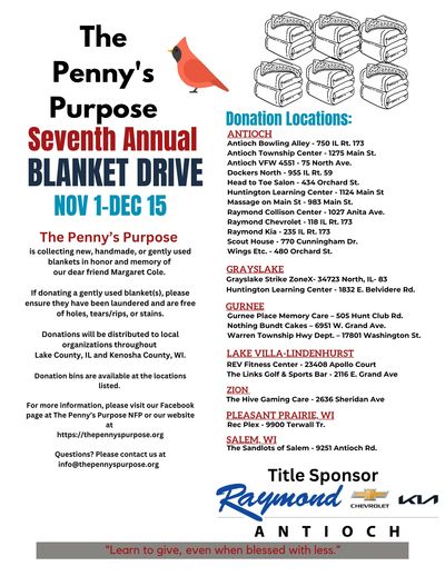 Since our first blanket drive in 2019, The Penny’s Purpose has collected more than 12,500 blankets to provide warmth and comfort to individuals, families, and pets in need throughout Lake County, Illinois and Kenosha County, Wisconsin.